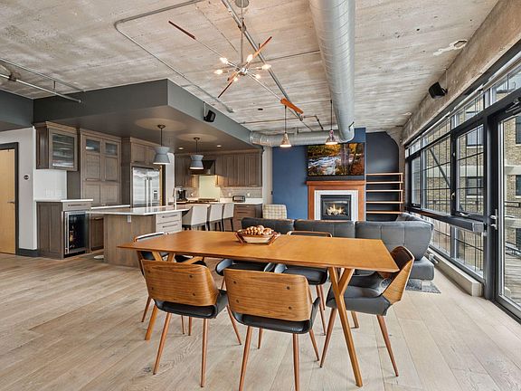 Stunning two-bedroom loft in the iconic Bookmen Lofts, in the heart of the North Loop. This exceptional residence masterfully combines industrial character with modern luxury, featuring rich hardwood floors, exposed brick, and wall-to-wall south-facing windows that flood the space with natural light. The open-concept layout is ideal for entertaining and everyday living, anchored by a designer kitchen with stainless steel appliances, custom cabinetry, and a large center island. The spacious living area features a gas fireplace and opens to a large private outdoor deck, an ideal spot to relax and soak in the city atmosphere. The second bedroom offers flexible use as an office, den, or guest room, making it easy to adapt the space to your lifestyle. Additional highlights include two underground parking stalls with an EV charger, access to an on-site fitness center, secure bike storage, and a beautifully designed community rooftop deck complete with lounge seating, firepits, and grills, perfect for entertaining or enjoying the skyline. Just steps from Target Field and surrounded by trendy restaurants, entertainment, and boutique shopping, this rare property designed by renowned architect James Dayton, delivers the perfect blend of style, comfort, and convenience, offering ultimate urban charm and character in the North Loop.
