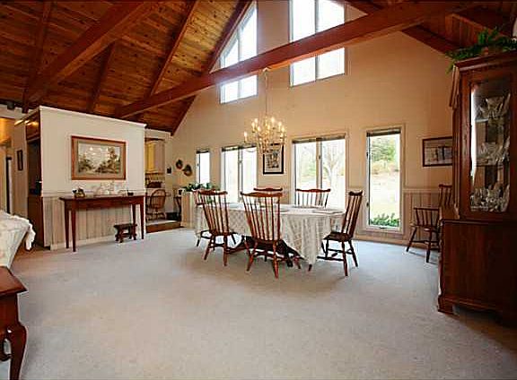 Immaculate, custom, waterfront home in Carrington Hills. Private on 2.6 acres. Dramatic vaulted wood ceilings in living and dining, 2 story stone FP, beautiful sunroom & screened porch w/ adjoining deck overlooking the neighborhood lake. Huge master suite w/ water views adjoins sunroom, has vaulted wood ceiling. Upstairs bonus room w/ pool table, full bath, & walk-in floored attic w/ custom shelving. Large bedrooms, one w/ access to deck and water views. Large walk-out basement. 9ft ceilings throughout.