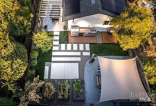 Located a 10 minute walk to downtown Healdsburg, this extensively remodeled home is a rare find and a true entertainers delight. The kitchen has a large central island, 6 burner gas stove, built-in refrigerator and large wine fridge which leads to an outdoor deck, outdoor dining area and onto a modern yard with kitchen, seating area and vegetable beds. As well as the new roof, new HVAC system, an owned 8 KW Tesla solar array and two Powerwall back up batteries, the home has numerous high end upgrades such as smooth drywall finish, built-in indoor speakers, outdoor speakers as well as a 6000W electric Bromic outdoor heater to enable you to enjoy the outdoor dining well into the fall. The large primary bedroom has a vaulted ceiling, spacious bathroom with a double vanity and walk in closet. The open plan dining/living space with high level smooth drywall finish on the walls includes built-in surround sound and leads to the two additional guest bedrooms and guest bathroom.