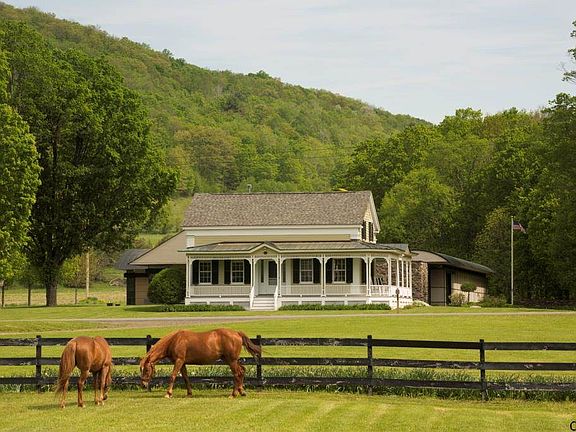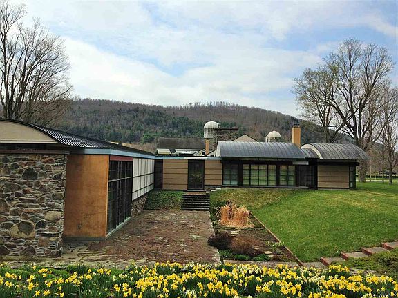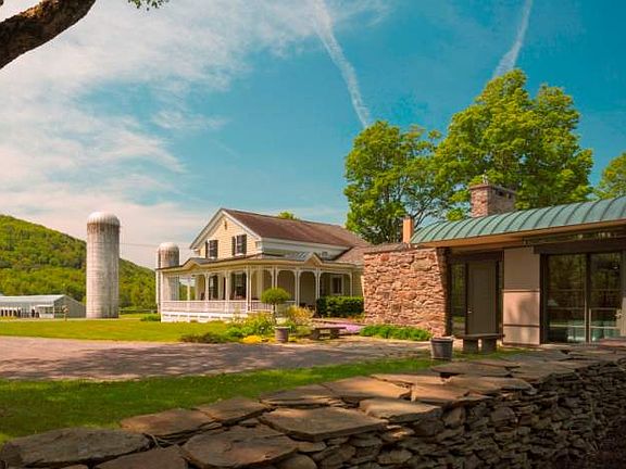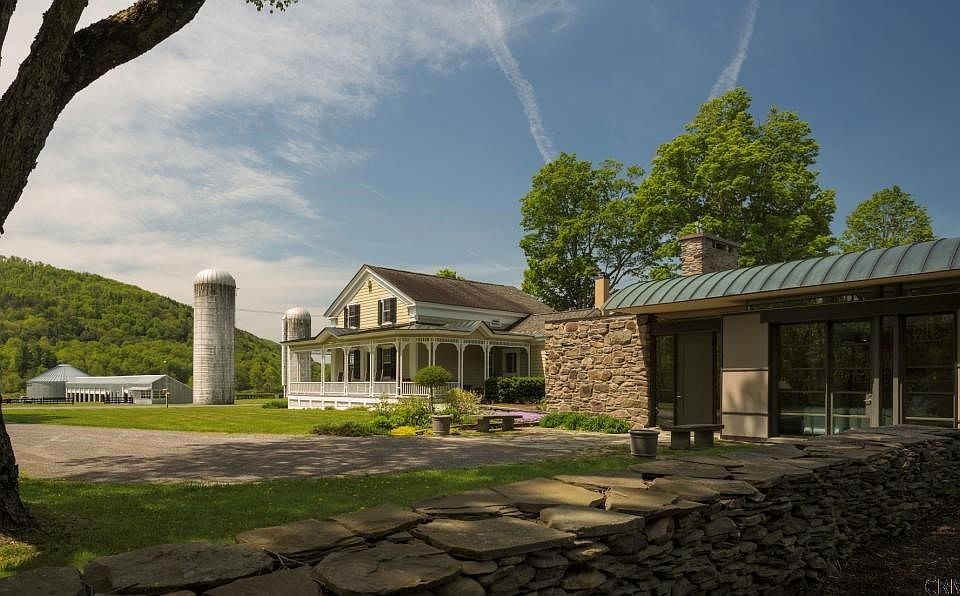 Circa 1795 Federal Farmhouse listed on the NYS and National Historic Register is known as Charlotte Valley Farms. The contemporary addition was added in 1992 by nationally acclaimed architect Peter Gluck and then featured in Architectural Digest. The sprawling 5873 sq ft home includes 6 bedrooms, and 5 baths with a mix of wood, steel and stone. Entire walls of stone include the stone fireplace in the great room,an end wall in the pool room, as well as on the exterior of the buildings. Vaulted ceiling with exposed beams in the great room,walls of glass and a state of the art kitchen are the center piece of the home that flows with natural light. The master bedroom suite has arched ceilings, a large walk-in closet and mountainside views.The master bath features a Japanese soaking tub, glass enclosed ceramic shower and marble sink. *Pool fountain/statue and wood stoves are NOT included in sale*