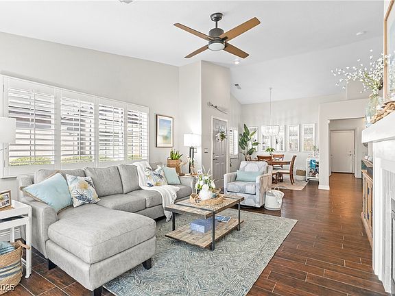 Discover this beautifully remodeled home in a gated community near DT Summerlin. Every detail exudes modern elegance: new wood look tile plank flooring enhancing the inviting ambiance. The light infused great room features a gas fireplace featuring custom tile & mantle. The dining room is perfect for entertaining & creating cherished memories. Kitchen showcases leathered quartzite counters, new SS appliances & sleek white cabinetry with soft-close drawers, pullouts, & an RO system. The primary bedroom includes an ensuite w/double sinks, marble counters, a garden tub & a stand-in shower w/stunning tile backsplash. Enjoy plantation shutters, custom closets, & updated lighting & ceiling fans. ADA Compliant. 2 Car Garage offers & storage racks. Relax on a large covered back patio with designer tile, a raised flowerbed & LED lighting. Steps from the Community Pool/Spa/Fitness. HOA covers exterior painting, roof, front landscaping, water inside/out & trash, blending style and convenience.