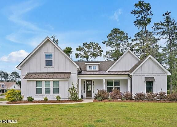 If you're looking for the perfect balance of coastal farmhouse charm, welcome home! This home was designed with attention to detail, inside and out. From the large, beautifully trimmed out foyer to the open airy family room, featuring soaring 10' ceilings, a gas fireplace complete with built-ins on either side; all of which are custom trimmed with timeless ship-lap details and maybe best of all are the the 16' telescoping doors that lead to the huge covered back porch. Imagine entertaining and the effortless flow with these doors open, allowing the outside in. The stunning kitchen opening to the family room, features quartz countertops, a large beautiful island, wood cabinets w/ soft close doors & drawers and last but not least, a full walk-in pantry complete with custom wood shelving along with the sweetest custom pantry door. The open dining room area has loads of windows for natural light and also a door allowing access to the back porch. Perfect for entertaining and grilling during those gatherings that are sure to happen. The master bedroom is striking with its 10' trey ceiling, wall of windows looking out to the back yard, barn door leading to the master bath; equipped beautifully with dual vanities and an exquisite walk in shower. There are two additional bedrooms on the first floor which share a bathroom; also with dual vanities. Upstairs offers the 4th bedroom with its very own private bathroom. Just in case you need more storage, also upstairs is easy access to the walk-in attic. Back downstairs, located just off the two-car garage is the mud room with built in storage and drop off area, along with a cheery laundry room complete with utility sink.