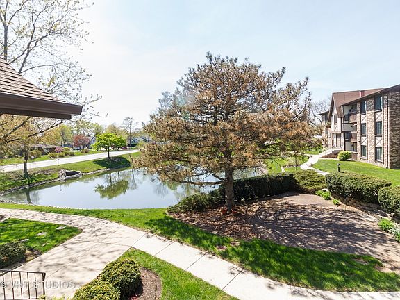 Rarely available, beautifully updated and lovingly cared for, spacious 2 bedroom, 2 bath condo in premium location overlooking pond. Laminate floors throughout. Freshly painted. Living room has sliding doors to balcony with panoramic view of pond area. Ample dining space. Kitchen has granite countertops, beautiful cabinets, backsplash, all stainless steel appliances including wine fridge. Lovely sculpted stone kitchen bar. Spacious master bedroom has walk-in closet and barn style door accessing full bathroom. Balcony can be accessed from both living room and kitchen. Full sized washer, dryer in unit. Furnace new 2015, AC 2019. 1 car garage conveniently located near rear door with room for storage. Nothing to do but move in!