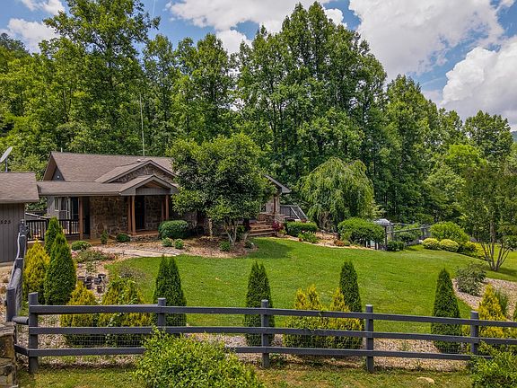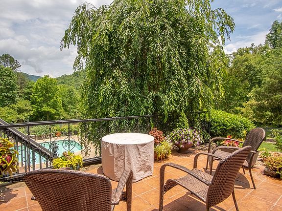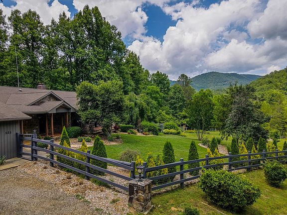 Stunning executive home located North of Franklin on just over 10 acres. Drive through beautiful Cowee Valley to get to this home. Lush manicured lawn with raised beds and lots of gorgeous landscaping. Want chickens? Large chicken coop and fenced yard allows for free-ranging. Back yard is bordered by nice stream. Enter the home through large stone patio, perfect to sit by the fire pit and take in the beautiful yard and pool area. Formal foyer that opens up into large dining and living areas. Large country kitchen with coffee bar, gas stove, double ovens and more for the cook in the family. The primary bedroom suite with office is located in the main level as well as the laundry making this home perfect for main-level living. Additional bedrooms, workout room, family room and large pantry are all downstairs. The downstairs is laid out so that you could turn it into either in-law suite or separate rental unit. Large open decks on both levels with hot tub and pool on lower terrace level deck and patio. Detached 3 car garage with office has plenty of room for all of your toys. There is also a large shed located behind the house. OFFER DEADLINE 5PM 7/11/22