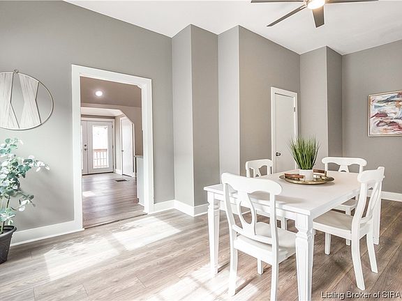 The large L-shaped covered front porch gives adorable curb appeal. Inside is filled with character and charm; Original fireplace frames and arched doorways. The main floor offers an open floor plan, large primary bedroom with walk-in closet and private en-suite, updated kitchen, utility room and more. The upstairs has 2 huge bedrooms. The rear has off street parking, fenced yard and has large covered porch. Licensed broker in Indiana and Kentucky has a financial interest in property.