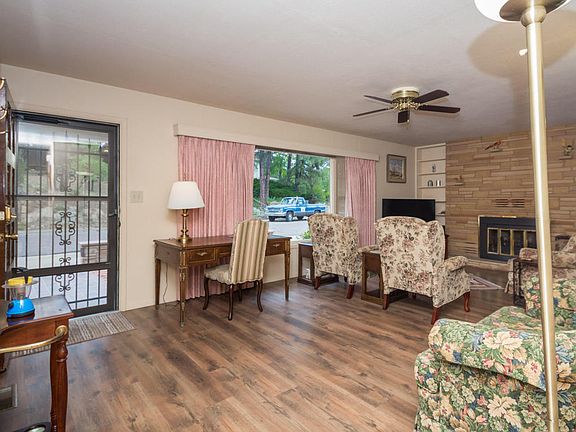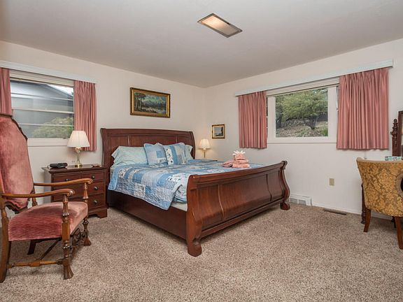8 blocks to downtown Prescott. Upper deck provides view of mountains & seasonal creek, and wraps around to spacious shaded patio. Upstairs has 2 bdrms, 1 bath, living, dining rm that opens to deck, and kitchen. Downstairs provides another bdrm and bath, with large storage and laundry rooms (great potential to convert to more living space) Store room dividing wall can easily be removed as can small area at bottom of stairs with door to family room that was installed to provide private living if desired. For a second home, rent upstairs and use downstairs w/ separate entrance when you visit.