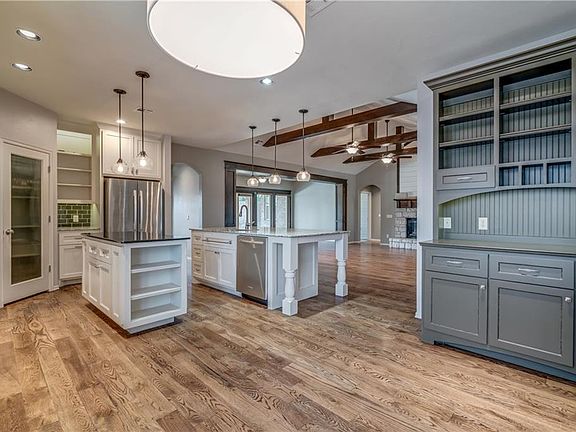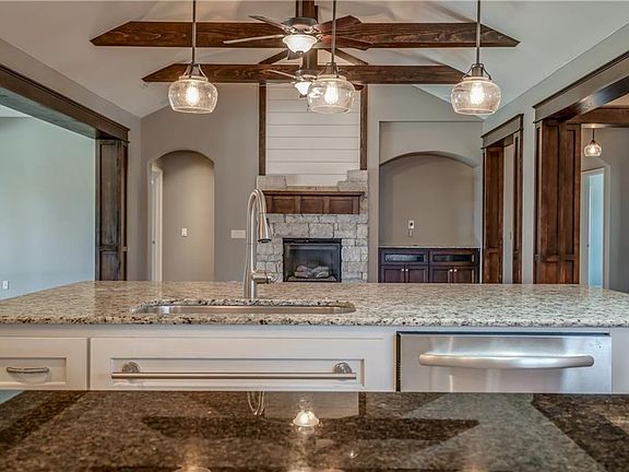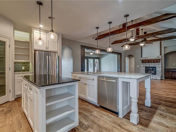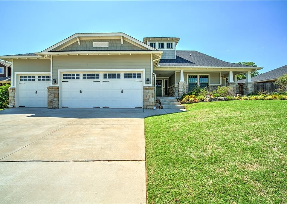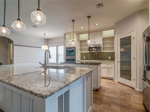 An entertainer's dream home! Custom built by an interior designer, this home is open with an award-winning designed kitchen (double islands) open to the vaulted living room, formal dining room & bonus/sunroom all on a SINGLE STORY. If you love light & bright (Hello,shiplap!), then this is your home. One-of-a-kind Cape Cod Coastal Bungalow in the Bungalow community Arbor Creek w/ a huge front porch. White cabinets, granite countertops, stainless steel double ovens. The bonus/sunroom can be open to the living room/kitchen or closed off w/ custom curtains - perfect for kids playroom, exercise room or quiet reading retreat. Rest of the home features 3 bedrooms & a private study. Large backyard w/ a huge covered patio & an added pergola. Great outdoor entertainment space. The home feels larger due to the huge front & back patios. You'll love spending happy times here! Minutes from Lake Arcadia, easy access to I-35 , new retail spaces and hospital there, OKC, Edmond and Stillwater.