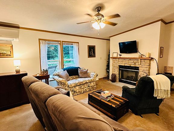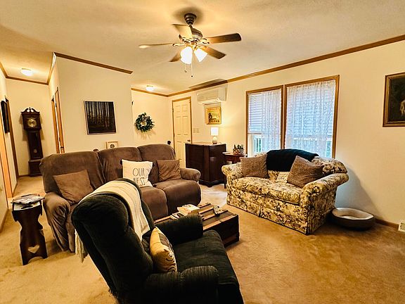 Well maintained double-wide on its own private four acres! Kitchen has stainless steel appliances and walk-in pantry. Living Room has propane fireplace and heat pump for air-conditioning and heat. Whole house has cathedral ceilings. Large primary bedroom with en suite and walk-in closet on one side of the house, and two more bedrooms with full bathroom next to the laundry area on the other. Deck looks out over large lawn and woods. Oversize Shed good for storing toys, and already had chicken coop primed. House has been pre-inspected by Atlantic Home Inspections. Open House Sunday 11AM-12:30PM