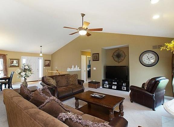 Come home to this open and airy ranch close to shopping, schools and minutes from major highways. Dramatic vaulted ceiling welcomes you in the dining room, flows throughout the kitchen and great room. Plant shelves separate the three rooms and add architectural flair to the open floor plan. Vaulted master suite offers walk in closet, luxurious bathroom with double-bowl vanity, soaking tub and separate shower. Two additional bedrooms and a full bathroom are situated on the opposite side of the house. Fabulously finished lower level boasting a full bathroom, two recreation rooms, a HUGE walk out family room, bar with custom millwork, sink and mini fridge. Outside youll find the low maintenance composite deck, large patio and fully fenced in yard...perfect for the kiddos or four legged friends!