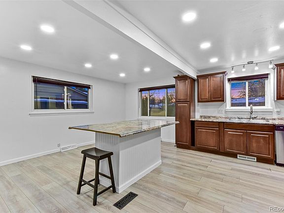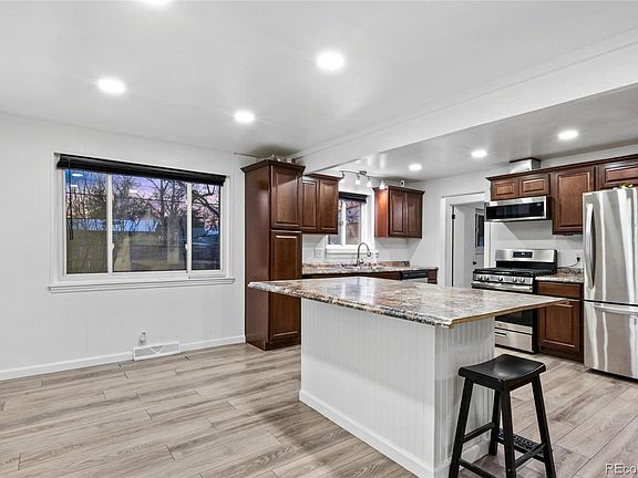 Wonderful Highland Park location! Classic mid-century modern brick ranch with an open floor plan on a tree-lined street close to schools, Del Mar Park, and 6th Ave shops. Six minutes from the Anschutz medical campus, and an easy commute to downtown Denver or DIA. New evaporative cooler in 2021. New roof in 2017. Kitchen updated in 2020 with stainless steel appliances, new cabinets, and an island. Main floor freshly painted in 2023. Enormous unfinished basement has laundry room, workshop, another bedroom (non-conforming), a large area perfect for a rec room, rough-in for a bath, and tons of additional storage. Easily finished to double your living space! One car attached garage and plenty of additional off-street parking. The fully fenced and irrigated backyard has room to roam for pets, or a big garden, or just relaxing in the Colorado sunshine (or staying warm in the hot tub through fall and winter). There's also a good-sized storage shed for more tools and toys.