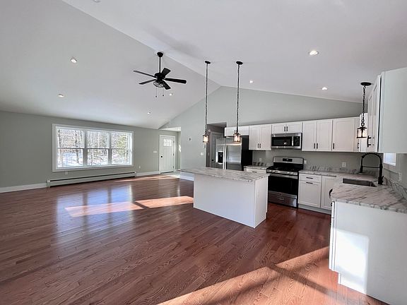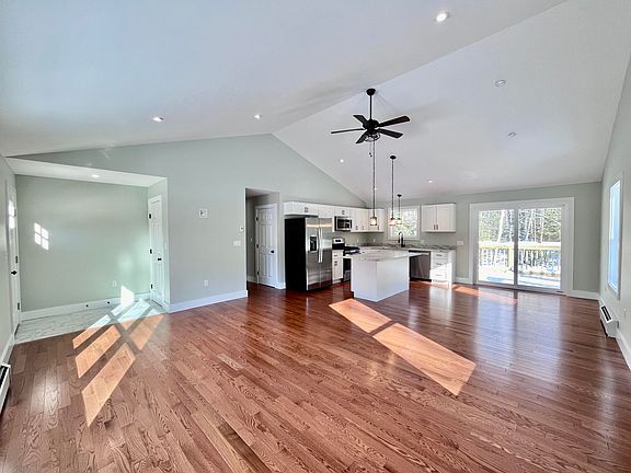 Beautiful New Construction on 5.1 wooded acres just minutes from Pleasant Mountain Ski Area. Move in ready now! 1288 square feet of living space on one level. Open concept living/kitchen/dining area with cathedral ceiling. Kitchen with classic white cabinets, granite countertops, GE stainless appliances including a propane range, island, pantry and dining area with sliders to the back deck. Three bedrooms including a primary suite with full bath, two additional bedrooms and full bath. Ceiling fans in all bedrooms and great room. Full daylight walk out basement for future expansion if desired. Washer/dryer hookups. FHW BB propane boiler. Real hardwood flooring throughout with tile in the bathrooms and entry/mud room area. MSAD 72 school district includes Fryeburg Academy. Taxes are on land only and to be determined for the house. Perfect primary or vacation home! OPEN HOUSE Saturday 12-2 PM. Any and all offers due Sunday, January 21, by 5 pm with a response time of Monday at noon.