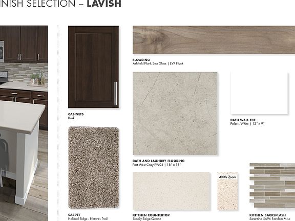 Entertain with ease in your spacious kitchen with adjoining dining and great room. Dusk cabinets with Simply Beige Quartz countertops, Ashfield Plank Sea Glass EVP flooring with multi-tone tweed carpet in our Lavish package.
