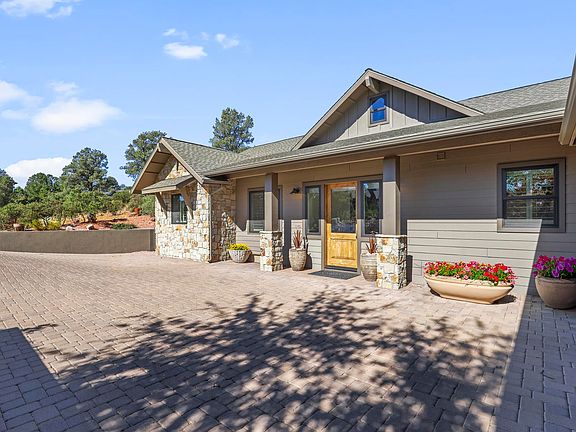 Charming single level home with fantastic views of the Mogollon Rim awaits you! This quaint beauty sits on in a quiet cul-de-sac and features 2 primary suites, a third bedroom, and an office/den. Built in 2018 boasting great features such as an open split floor plan with beamed vaulted ceilings in the great room, a wall of windows to capture the views, a wood burning stone ceiling to floor fireplace, wood flooring in the main areas, carpeting in the bedrooms and tile in the wet areas. The kitchen is well appointed with solid wood soft close cabinets, gorgeous granite, a large kitchen island, 6 burner gas stove,walk in pantry, and a wine refrigerator. Large back trex deck for entertaining and enjoying the beauty the Rim country has to offer. Garage has epoxy flooring and built in cabinets. There is also a soft water system in the home and a dog run for your 4 legged loved ones. Under the home is a large storage area that has great potential. So much to mention. Come see this one today!