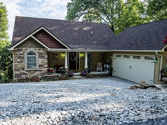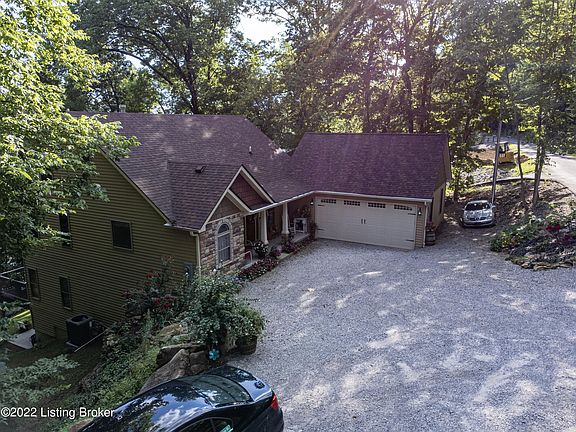 On the main level, the primary bedroom resides with access to the covered deck. As you walk in you are greeted with 18ft ceilings and an open kitchen, dining and living room space. The kitchen features custom cabinets with granite countertops and tile backsplash. Throughout the main level is hickory hardwood floors. Attached 2.5 car garage, finished with concrete floors, walks into the mudroom/laundry room and half bath. Upstairs features a single bedroom with a private bath. Downstairs you will be greeted by a den area, additional 5 bedrooms and full bathroom (includes a safe spot in closet). Luxury vinyl plank floor throughout the basement is perfect for easy clean up and low maintenance. If the finished space isn't enough - there is a bonus unfinished sub-basement for all your storage needs!! The outside space is equally spacious with 2 covered, composite decks and a lower-level patio - all with a view of the lake. The back yard, facing the lake, has been excavated to allow for usable leveled ground. Great place for a game of cornhole or a playground for the kiddos (as the sellers have used it). Check out for yourself all the lake charm this nearly new home has to offer!!