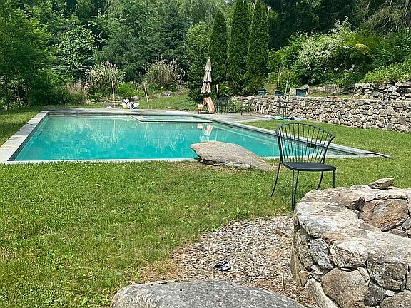 Property has it all : grassy back yard, side yard for toddlers, fenced pool and hot tub, fire pit and a wooded, private camp site. Outside features: Wood deck that extends the full length of the house, 4 perennial gardens House is open and sunny: Vaulted ceiling, contemporary with natural light, wall to wall glass, massive quartz island in newly expanded kitchen open to family room. Key features: 2 master bedrooms, one with balcony over looking pool. 4 bedrooms in total, plus loft, huge connected office with private entrance and parking spaces. Two fireplaces.