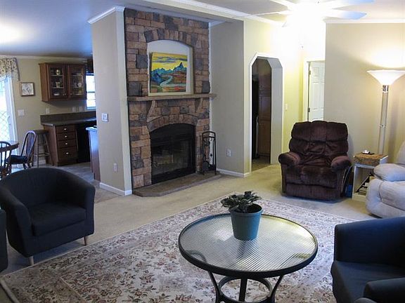 This 2012 Marlette Hearthside doublewide on two flat acres is move-in ready! Imagine relaxing in your large living room with cathedral ceilings and wood-burning fireplace or resting in three sun-splashed bedrooms, all with walk-in closets. The master bedroom has an en suite bath with glass shower with integral seat. The eat-in kitchen is low maintenance and just steps away from a 8x24 outdoor deck with views of the wooded hills behind the property. The laundry room is right off the kitchen with hookups and a mudroom with built-in bench and cabinet storage.