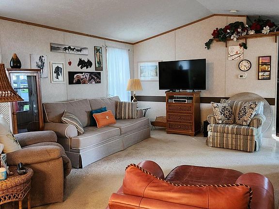 Welcome home to this beautiful one floor living located in a well maintained home park with creek access. Large living room and the kitchen has a nice dining area with gorgeous built in china cabinets and plenty of cupboard space. Master bedroom has a full bath with garden tub. Nice covered patio area and a shed for extra storage. Park must approve buyers. Lot rent is $490.00 / month