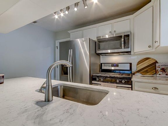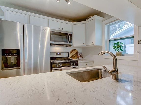 Tres Chic is the only way to describe this tastefully renovated pristine home in the highly sought-after downtown area of beautiful Dunedin. This 2-bedroom, 1 bath, 1 car detached garage home is open and bright with an excellent use of space and a joy to come home to. This glamorous home has all the upgrades and fine finishes to include, wood look tiles, crown molding, hurricane windows, a gas tankless hot water heater, updated electrical, updated plumbing, new paint inside and out, newer A/C (2016) and a newer washer and dryer. The bathroom is tastefully renovated with quality tiles and fixtures. The functional kitchen features an island, upmarket quartz countertops, newer kitchen cabinets, newer Whirlpool stainless appliances, tasteful white subway tile backsplash, and glamorous light fixtures. The fenced backyard has a gathering area around a firepit and offers privacy and room for a pool. The quaint front porch offers a seamless blend of indoor/outdoor entertainment living. This home located on a beautiful brick street is close to the Blue Jay stadium and downtown Dunedin. Waking distance to the water and Edgewater Dr. Jump in your golf cart and enjoy all that beautiful Dunedin has to offer.