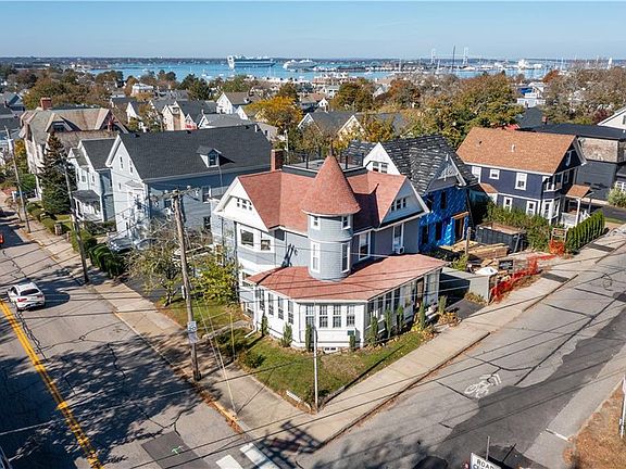 This home is truly inspiring. Built in 1890 and tastefully updated recently. With a very flexible floorplan boasting up to 6 bedrooms and a potential au-pair/in-law suite in the lower level. The JP Parsonage House sits on the corner of Spring and Narragansett within walking distance to the beach, docks, famous cliff walk, and all the shops, attractions and restaurants on Bellevue and Thames Street. The Queen Ann Style boasts an enclosed wrap around porch that connects to a grand entry way showcasing a beautiful oak staircase, high ceiling, and period detail. There are bedrooms and baths on all three floors, an updated kitchen with Viking Appliances, a formal dining room, den/library with detail work and built ins. (TWO FABULOUS FIREPLACES!) The double owner’s suite includes 2 room sized walk-in closets, dramatic travertine master bath with very large shower. Every room is soaked with light! The new driveway has a shed under construction. Two driveway entrances and plenty of off-street parking. Updates include 200-amp electric, modern high efficiency gas on demand heat and hot water, and newer plumbing and windows throughout. Two laundry rooms make for amazing convenience. The crown jewel is the roof top deck that offers a Birdseye view of downtown Newport, Newport Harbor, the Bridges, Ft. Adams, Jamestown, and beyond!