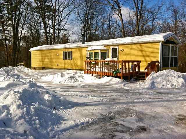 Located on 2.10 acres in a low dues community, close to game lands this 2 bedroom mobile home has a full basement foundation, new heating system installed on 2/17/15 and a less than 1 year old hot water tank.