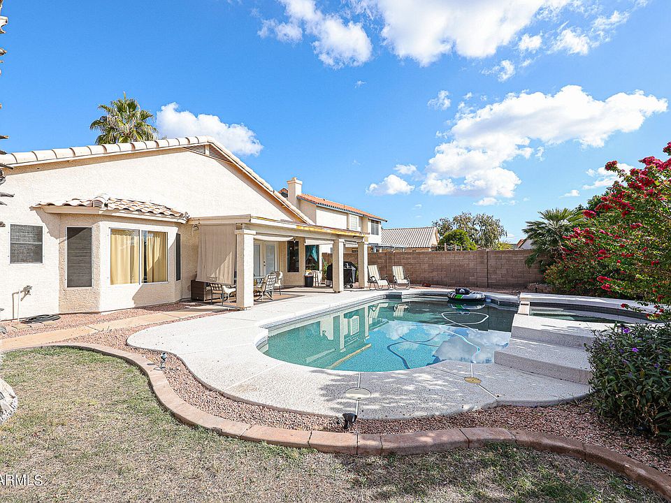 House is currently set up as a AirBNB. Single story 4 bed 2 bath in Mesa with NO HOA! Large murals and unique design features throughout. Great floor plan features central kitchen with stainless appliances and a breakfast nook with doggie door. Main bedroom has a spacious closet with its own full bath. Beautiful nursery with artist-made cloud chandelier. Second large bedroom includes adorable window seat. Bar area in Living Room with under-cabinet beer and wine fridge. In-ground pool with tablet-automated hot tub. Back door has child lock with alarm. Large cactus and two fruit trees in front yard. Salt less water softener and a Level-2 Electric Vehicle charger installed in 2-car garage. Property was a managed short-term rental while owners were living overseas. They are not returning to Arizona so all furnishings and items within the home to convey.