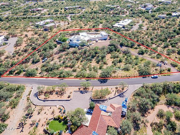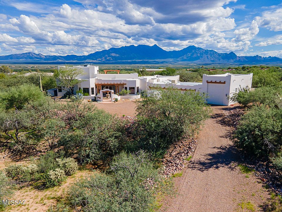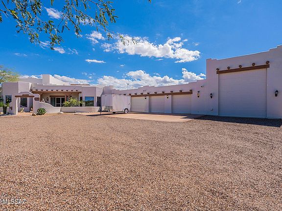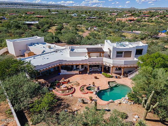Luxurious Santa Fe home in the prestigious Foothills of Green Valley. Complete Comfort with every amenity, inside and out, wrapped in a Spectacular Setting on 3.3 acres of privacy, desert wildlife and Awesome Views. 15ft wood/beamed ceiling in the great room. Huge Gourmet Kitchen featuring Hickory cabinets, Sub Zero refrig and freezer, Dacor 6-burner gas cooktop in the 7ft granite island, prep sink, butler pantry, wet bar. Enormous Master Bedroom Suite with a 10x10 custom walk-in closet adjacent to the laundry room and elegant bath. Separate wing for the two guest ensuites. All rooms including a full bath open on an Amazing Resort-Style Patio, Saltwater Heated Pool, Spa, Outdoor Kitchen, Firepit. A spiral staircase leads to the 2nd floor Viewing Deck and interior theater/media room. The upstairs with its bathroom could be converted to another guest suite, office or hobby room. An abundance of built-in cabinets in the 4-car garage and a separate room assure plenty of storage space. A circular driveway allows easy maneuverability into the 45ft RV garage with 200amp service. Zoned heating/cooling in the home and a portion of the 4-car garage. This special property showcases extensive detailing and superior quality throughout. Schedule a showing today to tour one of Green Valley's finest.