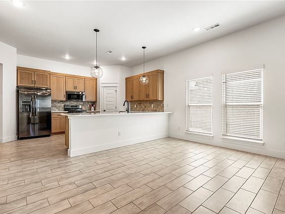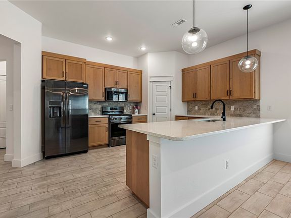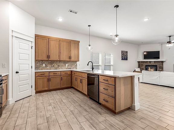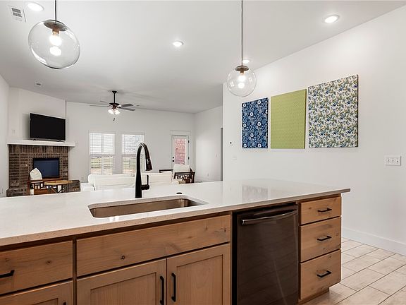 Like-new, beautifully upgraded home with an open floor plan, just minutes from the new Walmart campus, I-49 and schools. The chef’s kitchen boasts modern shaker-style wood cabinets, quartz countertops, a pantry, black bar handle pulls, upgraded lighting, a gas range, charcoal stainless appliances, and a spacious eat-in area. The open living room features sleek tile flooring for easy maintenance and a cozy electric fireplace in the corner. The large primary suite offers a luxurious ensuite with double vanities, a soaking tub, a walk-in tile shower, and a walk-in closet with direct laundry access. The two spacious secondary bedrooms offer ample closet space and share a stylish bathroom with modern finishes. Nestled on an unbeatable lot with a secluded feel, enjoy the covered patio overlooking a lush sodded yard, mature trees, and scenic views.