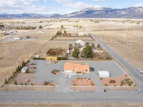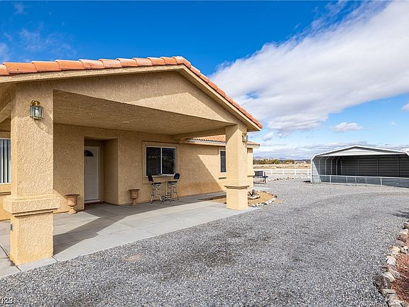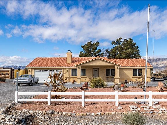 Well maintained & move in ready home! 3 bedroom, 2 bathroom, 2 car garage built in 2005. Split floor plan. Living room has a wood burning fireplace & a stunning view of Mount Charleston! Recently installed new flooring in the main area & new blinds throughout. Spacious kitchen with breakfast bar & pantry. Primary bedroom has 36’ doors to the bedroom and bathroom with a large walk-in closet. 2nd bedroom has access to the 2nd bath and a door to the back patio. Great size primary and second bedrooms. Garage is finished with additional storage. Recently fully fenced and landscaped with added gravel and decorative rock. Mature trees. Front covered patio with a concrete walkway to the back covered patio. 2 car carport installed in 2020 (included). 2 storage sheds in the back yard. Plenty of space to park your RV, boat & more! Bring your horses and livestock! Corner lot with access from both streets. Make this house your new home!