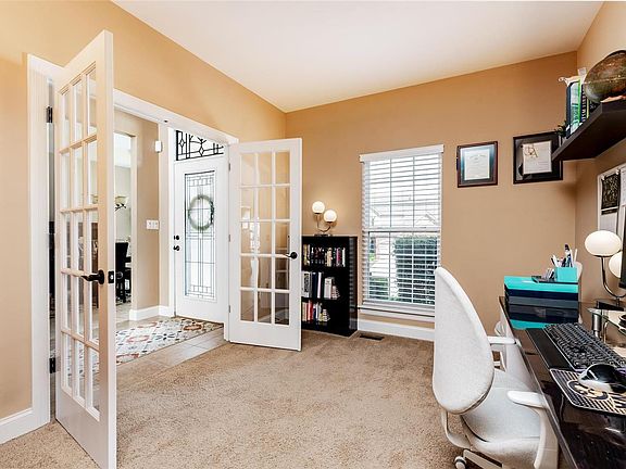 This stunning 1.5 Story luxury home in a quiet subdivision is situated on a quarter acre lot. The entry Foyer opens to an Office with glass french doors & a formal Dining Room. A chef's Kitchen with quartz countertops, center island, pantry, and staggered maple cabinets opens to a Breakfast Room and spacious Great Room with a 2-story stone fireplace, floor to ceiling windows, & book-in bookcases. Breathtaking views from the covered deck with built-in sunscreens off the Breakfast Room. Main floor Master Suite includes a large walk-in closet and full bath with dual adult height vanities, garden tub, & oversized shower. A Powder Room & Laundry Room round out the main floor. Upstairs find 3 additional large Bedrooms with walk-in closets, a Loft bonus area & a full hall Bath with dual sinks & tub/shower. Walk out lower level with a sump pump, egress windows, & bathroom rough-in. In-ground sprinkler system. Oversized 3 car garage. Subdivision Pool and Tennis included in HOA fees.