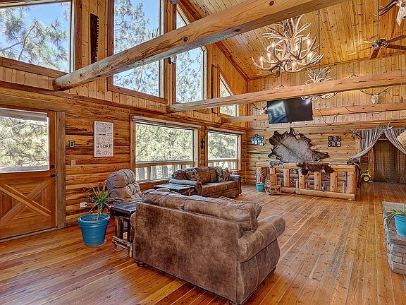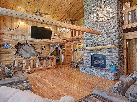 Stunning Log Home with 4 bed/3 bath located on a beautiful 14+ acres with trees and a year round creek. The large main floor has an expansive living room with floor to ceiling windows, stunning propane fire place, hickory cabinets, soaring ceilings and wood floors. The master suite is located upstairs with it's own walk out, Daylight basement has 2 additional bedrooms, laundry, bath and open family room with a wood burning stove. Wrap around deck, 48X48 barn, 24X48 shop, pasture, RV parking.