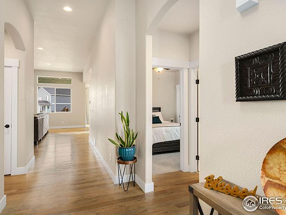 Better Then New ranch style home built by Bridgwater Homes for a Great Price in Amazing Location backing to open space with a finished daylight basement. The home offers an open floor plan on the main with hickory hardwood floors, a gas fireplace, high ceilings, oversized windows, gourmet kitchen with a double oven, stainless steel appliances with a gas range stove & vent hood, farmhouse sink, quartz island with lots of storage, Tharp soft close 42" cabinets, & a walk in panty. The primary bed has bay windows, a 5 piece luxury bath with grantie & tile shower with pebble stone floor & a walk in closet. Enjoy the sunsets views from your nice dining area & your spacious covered back porch that leads to open space, that leads to walking & bike trails, that leads to Timnath Community Park, which has all the activities you can think of (playground, pickleball, tennis, basketball, a dog park, & so much more. The daylight basement offers a big Family/Rec room with 9 ft ceilings and a wetbar with quartz counters & mini frige for entertaining or relaxing, 2 nice sized bedrooms, another full bath, and a huge storage area with shelving. Dual Zone hvac system with 2 thermostats, 3 car garage with 8ft doors. Blocks away from the pool & Bethke elementary. Beautifully landscaped & fenced back yard with a concrete patio. Covered patio has solar shades & is cable/ethernet ready. Timnath South Park is a mile away. Your Dream Home Awaits You.