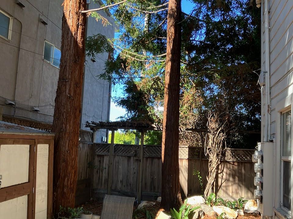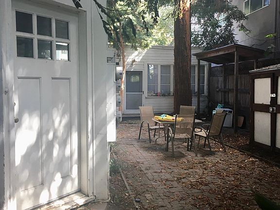 Victorian, sheltered from the street behind a redwood fence. Large patio with redwood