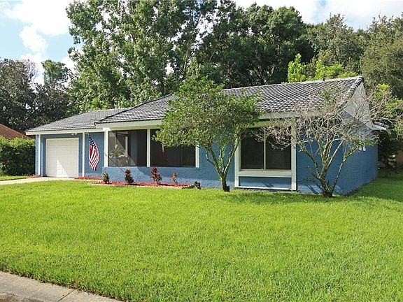 Location, location, location! Situated on a quiet corner lot as part of a small cul-de-sac, you can already imagine the tranquility of enjoying your morning coffee on the covered front porch. TOUR THE HOME WITH THE VIDEO TOUR LINK. Step inside the home and the open concept living room wraps around to a dining area adjacent to a kitchen that will delight the family cook with PLENTY OF PREP SPACE and a GAS RANGE! The 2 bedrooms are spacious, with the master bedroom sporting a LARGE WALK-IN CLOSET and DOUBLE VANITY. The one-car garage offers good storage space, as does the large laundry room. The home has newer interior and exterior paint, a BRAND NEW AIR CONDITIONER, and additional attic insulation. Plus the reasonable HOA fee includes weekly lawn service so you can use your time off to sample the nearby restaurants, major theme parks (each no longer than a 10 minute drive), or enjoy the neighborhood amenities which include a large pool, tennis courts, and recreation building. Time to call this gorgeous house your home before someone else does!