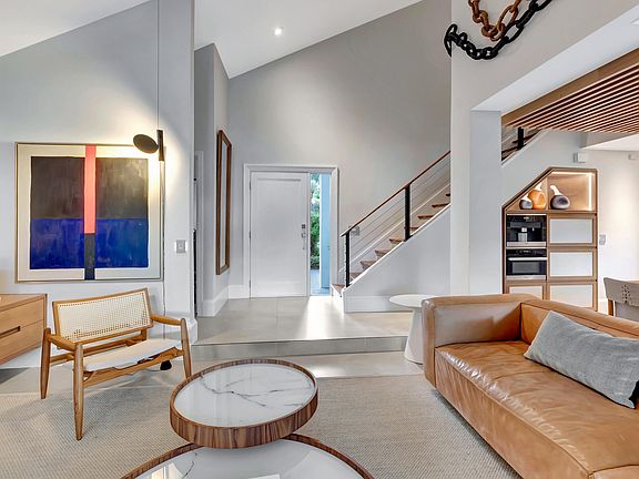Introducing the opportunity to immerse yourself in the many thoughtful features the Broken Sound Country Club has to offer. Located in the village of Cedar Cay, this renovated townhome has been created into a masterpiece with sophisticated designer finishes. Step down into the light filled formal living room that flows into the formal dining room, with vaulted ceilings, smooth walls, and porcelain tile floors. Entertain your guests while using the unique built in wood Miele coffee station and beverage bar decorated with LED lights. The kitchen is open to the living room with contemporary details that include 2 tone white and grey cabinets, marble counters and stainless appliances. You'll love the upstairs primary bedroom with basket chandelier, modern barn door and walk in closet. Your family and guests have their own space upstairs with 2 bedrooms & full bath. Enjoy the finest quality of porcelain tiles and astro turf used in the backyard with new palm trees and offers direct access to the heated community pool. Brand new roof replaced in 2023.