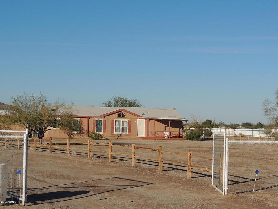 MOVE IN TODAY - HORSE PROPERTY!! Complete with horse pens, round pen, arena that has had rock professionally removed! Landscaped front yard just two lots away from Vekol Wash for trail riding. Close to roping and barrel racing arenas too!! Enjoy your evening meal on covered porch looking out to beautiful mountain sunsets! Complete flooring and paint, counters and sink need replaced as the low list price reflects.