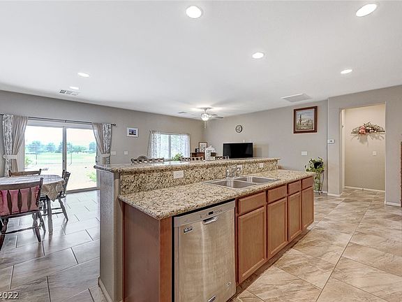 Awesome view of the golf course and mountains.Maintenance free backyard with covered patio. Enjoy watching golfers on the green.Unobstructed view-no houses behind this lot!Home features 3bedrooms plus office, which can be converted to 4th bedroom. Beautiful upgraded tile flooring, maple cabinets. Wide entrance into great room with island kitchen granite counters. Primary bedroom is separate from others. Walk out to covered back patio ideal for hot tub. Primary bath has dual sinks, bath and shower plus large walk-in closet. This home shows pride of ownership and is move in ready. If you are seeking a great view and easy maintenance this is worth checking out. Community has lovely clubhouse with large well equipped gym, two pools,one for children and restaurant. Beautiful 18 hole golf course not included in HOA Fee.