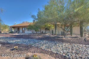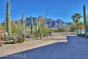 Some properties just have IT! This is one of those. Character abounds in this amazing ranch situated on 2.5 acres with breathtaking views of Superstition Mountain. Complete horse setup with 4 stalls, tack room, horse wash stand, arena & 2 workshop/sheds. State land riding trails 1/2 mile from property! Home features 4 bedrooms & 3 baths (2 masters with private baths -check out that gorgeous slipper tub!) Greatroom floorplan with vaulted ceilings & fireplace. Kitchen features tile countertops & knotty oak cabinets. New kitchen appliances, AC in 2012. Skylights create a light & inviting space. Enjoy those mountain views from your custom tiered patio constructed of imported brick complete with covered patio & firepit gathering area. Winding pathways & mature landscaping for shady afternoons.