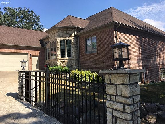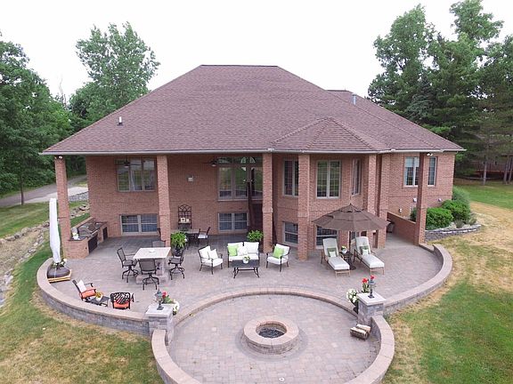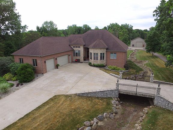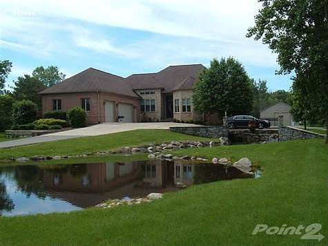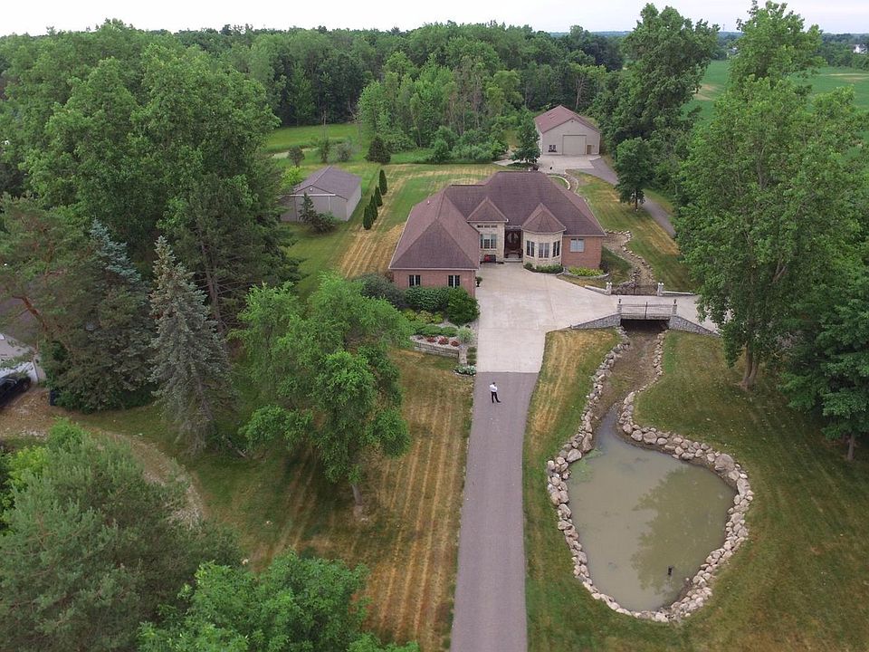 Exquisite brick custom-built home nestled on 3 acres with a bridge overlooking the stream and pond.This home features 5,600 sq. feet of living space w/ 3 possible 4 bedrooms and 3 full baths. Gourmet kitchen with granite countertops, cherry cabinets, stainless steel appliances and an island. Fire lit great room with vaulted ceilings, den with french doors and built in cabinets. Spacious Master Suite with jetted tub and his/her walk in closets. Family room with gas fireplace and built in book shelves. Formal dining room for entertaining. Lower level with natural light includes rec room,bedroom,exercise room,full bath,butlers pantry and craft room. Beautifully landscaped with a covered patio and fire-pit. Pole building 48x80... MANY UPDATE