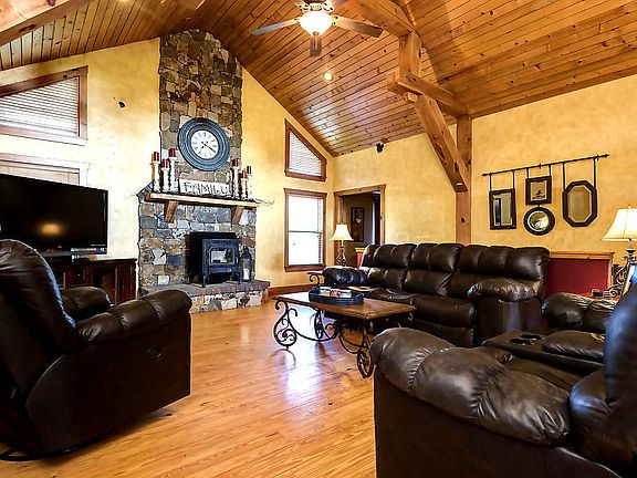This Beautiful Rustic Style home is located in the Highly Desired neighborhood of Autumn Woods Estates. It sits on aprox. 8.14 Acres with a detached 2 car garage Plus Outbuilding/Workshop which includes a half bath and cabinets! It also has a shed! This was a Custom Built Home with Large Exposed Beams and Box Car Siding on the vaulted ceiling in Living Room. 6 Panel knotty pine doors and custom wood work throughout! Beautiful pine wood Floors. Chef's Dream Kitchen with plenty of space and cabinets! Nice Master Suite with a double vanity and nice Walk-In Shower! There are 3 bedrooms an office plus partially finished walk-out basement.! Two decks on the upper level, one with an Outdoor fireplace which makes it cozy in the fall and winter. Don't Miss This One! 15 Minutes to Springfield!