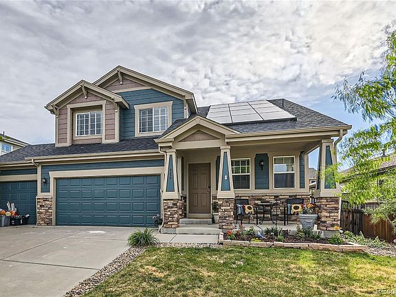 Stunning two story home with finished basement in Brighton Crossings.  5 bedrooms, 4.5 baths, updated kitchen with new Quartz countertops being installed June 5th!! Western facing for faster snow melt.  2 air conditioners, 2 furnaces, gas fireplace and SOLAR!! Solar Is owned outright by seller so no monthly payments, only savings! Finished basement is perfect for guests or teens. Could also be an excellent space for an office and/or craft room.  Zoned for Padilla Elementary that is less than a 10 minute walk away.  Walking distance to the Venture Center which offers a fitness center, pool, kids splash pad and water slide!! Don’t miss this gorgeous Brighton Crossing Home! PRICE TO SELL!!! *New appliances 2021 – refrigerator stays *New interior paint 2022 * Front, rear and flower bed sprinklers * HUGE 3 car garage * Vaulted ceilings * Open concept* Fenced yard w/deck * New ceiling fans & light fixtures throughout * Close to I-25, I-76, Target, dining & shopping * Located 10 minutes from Barr Lake for outdoor recreation * 20 minutes to DIA * Easy access to E470