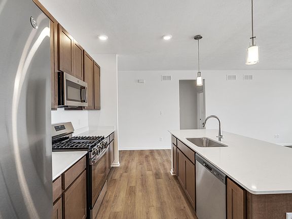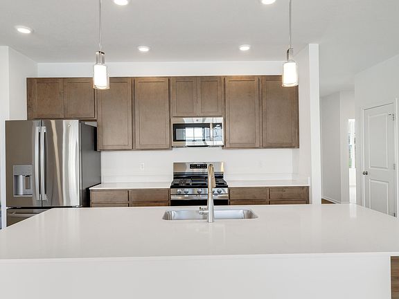 Low maintenance living in the Adagio! An open concept floor plan with 2 bedrooms, 2 baths, den and sunroom off the kitchen with amazing views of the pond. The kitchen showcases maple cabinets with quartz countertops, stainless steel appliances, island and walk in pantry. The owner's suite has a tile shower, double bowl vanity and walk in closet. Fully landscaped with irrigation. Deck. Lookout basement with rough in plumbing for a future bath. All with the Industries Best Customer Care Program and Warranty!