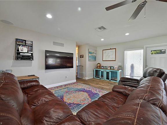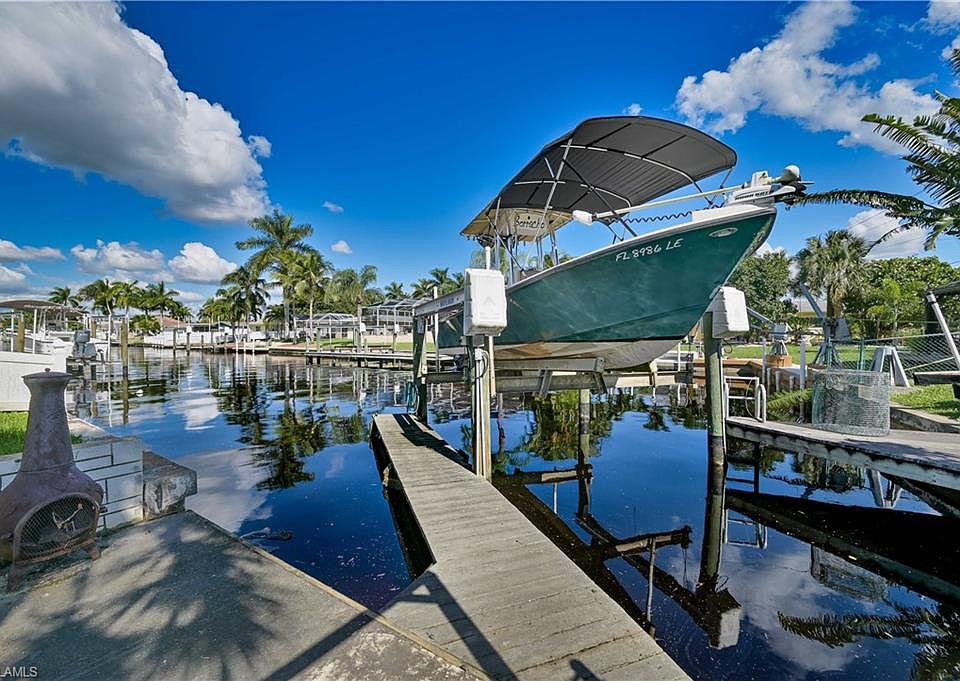 Boater's delight!! Only ten minutes to open water, this beautifully remodeled gulf access home sits on an oversized corner lot in the Cape Coral Yacht Club community. This 2/2 plus bonus room is perfect for entertaining with an open floor plan, flush-mount high end surround sound, and floor to ceiling windows overlooking the the water and sunset views. Fish from your own dock on an 80ft wide canal with 6,000lb boat lift. Or, relax in privacy on your hammock under the tiki hut, in the extra large fenced-in back yard. Plenty of room for a pool. Just a bike ride away from the community beach, pier, and many excellent restaurants!!