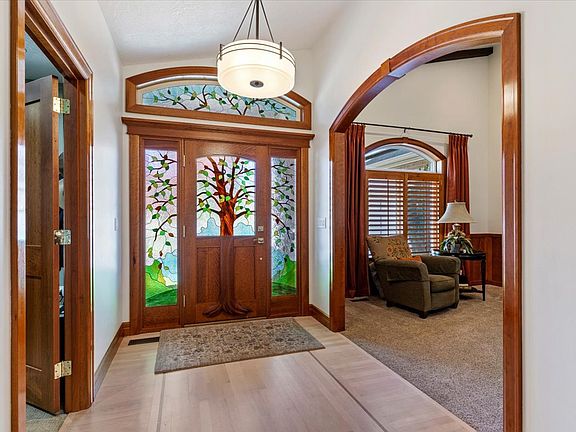 Welcome to the home you've been waiting for! Nestled in the coveted Trapper's Pointe subdivision, closest neighborhood to Snowbasin, this full-brick rambler is a masterpiece of design and comfort. Beginning with a custom carved wood & stained-glass front door, the moment you step inside, you'll appreciate the solid natural maple floors, tall, vaulted ceilings, plantation shutters, Solid Cherrywood doors and mouldings, and beautiful custom cabinetry and built-ins that elevate the home. The main floor boasts a formal living room, a private office, large laundry room, and a fantastic great room featuring a cozy gas fireplace, with carved mantle, flanked by custom built-ins. The heart of the home is the updated kitchen with white oak cabinets, Sub-Zero & Wolf appliances plus two Bosch dishwashers, a hidden pantry, plenty of countertop and cupboard space, beautiful backsplash and custom range hood. Retreat to your luxurious master suite, complete with its own fireplace, hand-built shelves, large walk-in closet, and spa-like shower. Downstairs, the fully finished daylight basement offers a full second kitchen and dining area, family room, 3 more bedrooms, tons of flexible room, and plenty of storage space. The outside is just as impressive: enjoy your morning coffee on the covered deck or lower patios, gather around the outdoor gas fire pit, or appreciate the serenity provided by the custom, private landscaping. The large pergola includes a high-pressure mister to make a summer day comfortable. Practical features abound, including a large garage with a workshop, solar panels, geothermal heating & cooling, a whole-house generator, a greenhouse, an elevated playhouse, and permanent LED holiday lighting. With amazing views in every direction, this property truly has it all! Sq. footage per tax data. All information is provided as a courtesy and should be verified by Buyer.