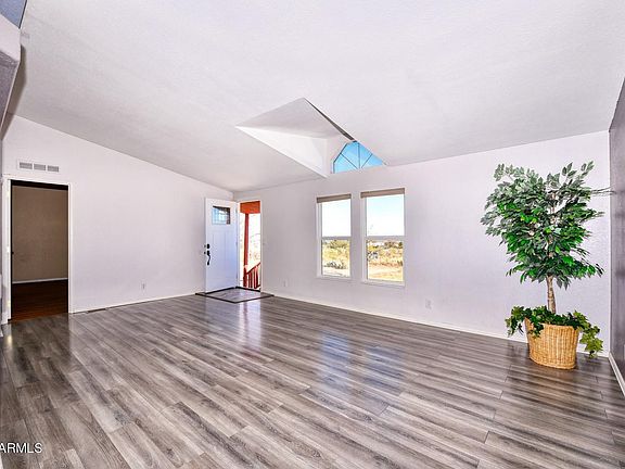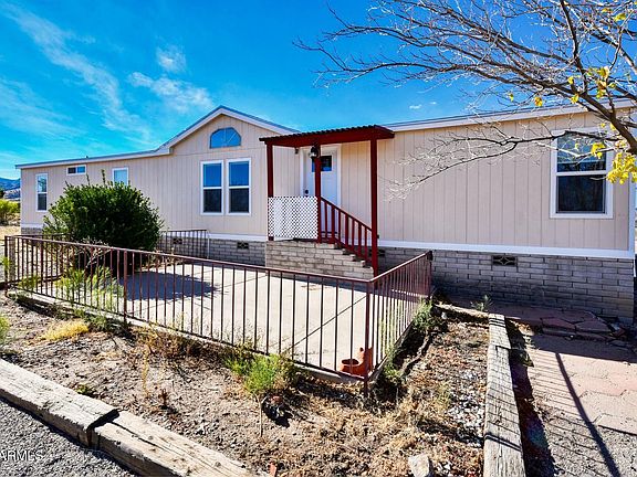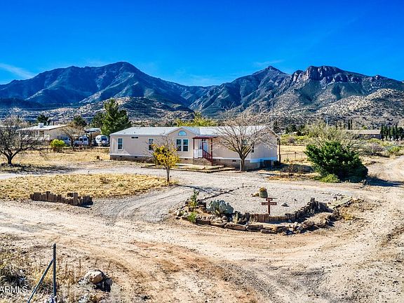 Priceless views; sweeping 180° from the front; from The border Wall/Naco up the San Pedro River basin, to Dragoon. And from the back, butted right up against Miller Peak/Coronado mountains. The 1900 sq ft, 3 bdr, 2 bath house is on a VA approved permanent foundation, along with a large, tiled, bonus room off the dining room area. The main house features a mix of wood laminate and tile flooring, from a major upgrade done a few years back. The shingle roof and central heat and AC system was also replaced only a few years ago too. This home has a factory fireplace. And in 2021, a professionally installed 2000 sq ft, mobile home rated, wood burning stove was also added. Further, new mini split AC/heaters were installed in each bedroom, for added efficiency, and a large 2 ton was installed in the family room. Ceiling fans complete the efficiency plan. In this home, at any time, you can easily be as warm, or as cool as you want, cost effectively too. This house is on a septic system, propane gas, and a shared well. Its nearly off grid. Low maintenance, eco friendly landscape enhancements have been made. A patio slab was poured out back too. A new 20' fire pit/ring is a wonderful area in the back yard to socialize while enjoying the beautiful AZ sunsets behind the mountains, while making smores A permitted 12'x32' Emerson Barns shed was installed in 2021 in the back yard. The property is on the corner of a six neighbor culdesac, and a rarely used dirt road. It is generally very quiet. The property was professionally surveyed last year, so there is no questions about where your property boundries are, on this 1.23 acre lot. Inside, the two smaller bedrooms, and one bath are on one end of the house, and the large MBR/dual sink bath is on the other end of the house. Other features are; an enclosed pantry, a nice size seperate laundry room with outside access, dual pane windows, fresh paint, remodled wellhouse, RV access gate to the backyard, plenty of room for all your stuff, and no HOA to worry about. The location is actually close to the hwy, but you'd never know it. It seems very remote.