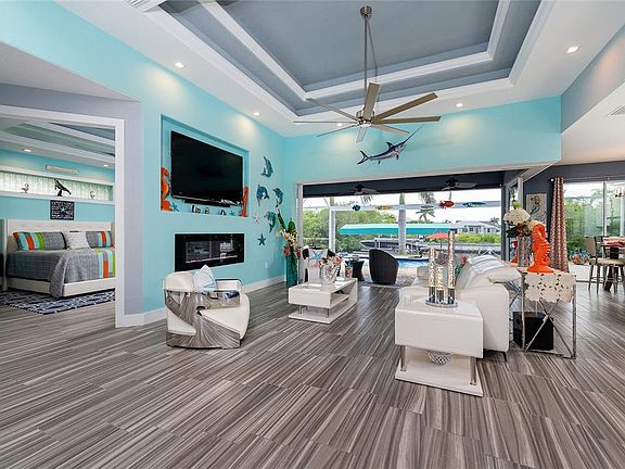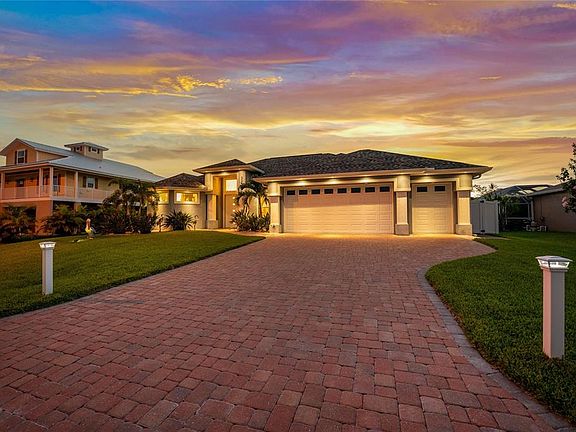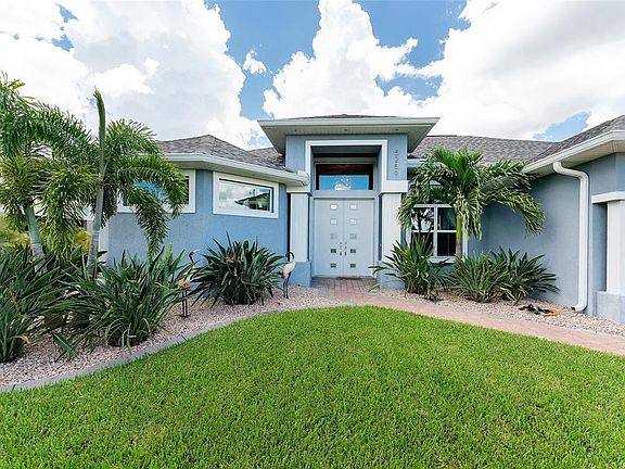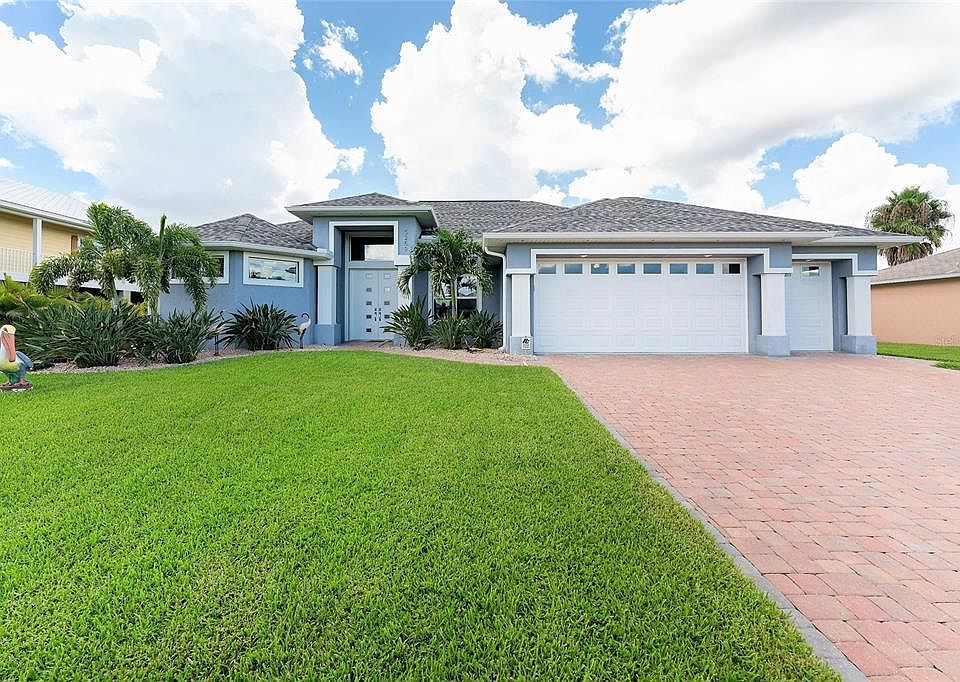 Welcome to your piece of Florida paradise! Located in the highly sought-after community of Gulf Cove. This property is a boater's dream! Open water access in a matter of minutes. This location is centrally located near dining, shopping, and entertainment while also granting short access by boat or car to nearby beaches. Plus, no deed restrictions! The moment you arrive at this elegant home you will begin to appreciate the upgrades beginning with the stunning landscaping/hardscapes, unique soffit LED home accent lighting along with paver driveway. Double door entry welcomes you into this waterfront home where your eyes will immediately be drawn outside to magnificent, unobstructed water views through 90-degree Pocket Sliding Patio doors. Ideally set up for unifying indoor/outdoor living spaces, you will be able to increase your entertaining area by opening sliders to the inviting lanai w/pool. Once inside this modern contemporary home you will be greeted by the beautiful porcelain flooring and tall ceilings throughout this stunning home. The deluxe contemporary kitchen sits in the heart of the home and features modern style high-gloss custom cabinetry, granite countertops with glass tile backsplash, expansive island, abundance of storage, stainless steel appliances including beverage cooler, built-in convection oven and microwave, and induction cook top all overlooking your living/dining area. Living room has double tray ceiling with Industrial Style ceiling fan, and 60" built-in remote-controlled electric fireplace. Stunning master suite will wow you with its tall lighted double-tray ceiling, private access to pool/lanai, two custom built walk-in closets with California style organizers. Beautiful master bath featuring Roman style walk-through shower with beautiful glass wall tile, deluxe 6 function shower unit, and his/her comfort height floating vanities with under cabinet lighting. The 2nd and 3rd bedroom sit at the opposite side of the home are awaiting family, and friends along with spacious full guest bath with pool access. Beautiful den/office with glass French doors located off the living room. Laundry room offers cabinets for plenty of storage, counter/sink area, and doorway out to a fenced in area great for your pets. Outside is an entertaining delight, showcasing beautiful, heated salt-water pool with decorative Mosaics in pool floor, large sun-shelf, two fountain water features, outdoor shower, sealed brick pavers, and large Picture View screened pool cage overlooking the waterway. Fenced in backyard along with hardscaped sand area for sunbathing or a fire pit. Stunning home has cement seawall, 35x 11 2 level boat dock with composite decking, 10,000 lb. boat lift w/remote control and full canopy cover, water/electric. Other features include Central Vac system, irrigation system, future outdoor kitchen plumbed with water & drain along with electrical, 3-Vehicle Garage with 2 additional width in 2 car area (oversize 18 wide door) and additional gulf cart area, WIFI garage door openers, along with so many more features throughout.