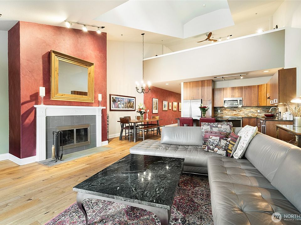 Cozy wood-burning fireplaceTop-floor loft-style condoGleaming hardwoodsWalk-in closetWine fridgeInduction cooktop