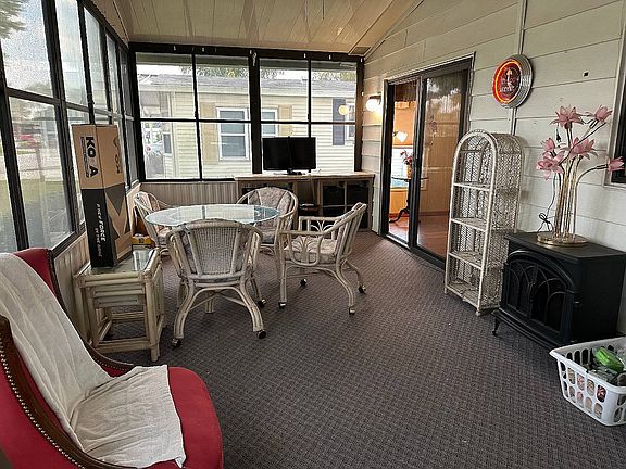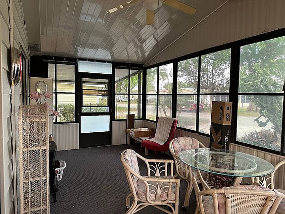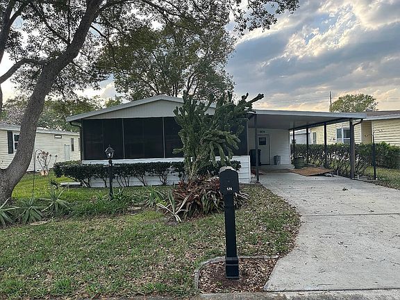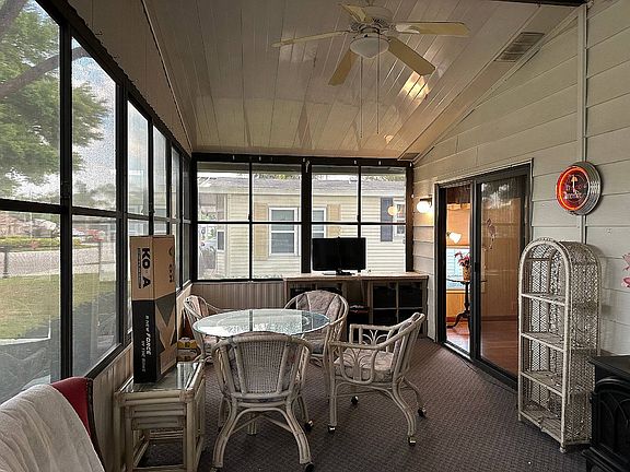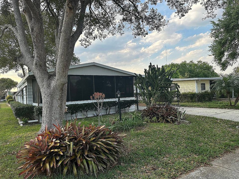 is how you will find this recently renovated comfortable home nestled on a well maintained exterior with plenty of shade trees complete with very attractive floors surrounding the home. A recently modernized and freshly painted kitchen complete with new cabinets, counter tops and new appliances is a pleasant surprise. Newer laminate flooring is found throughout kitchen, living, and dining room. Both bathrooms have newer flooring. House is complete with newer double hung storm windows throughout. A fully furnished vinyl windowed overside sunroom offers another 220 sqft of enjoyable living space. Plenty of storage in both closets as well as a recently enlarged, modernized shed (200 sqft) complete with some tools and a newer lawnmower, and washer/dryer. Located in a well sought after 55 plus senior community in Central Florida.