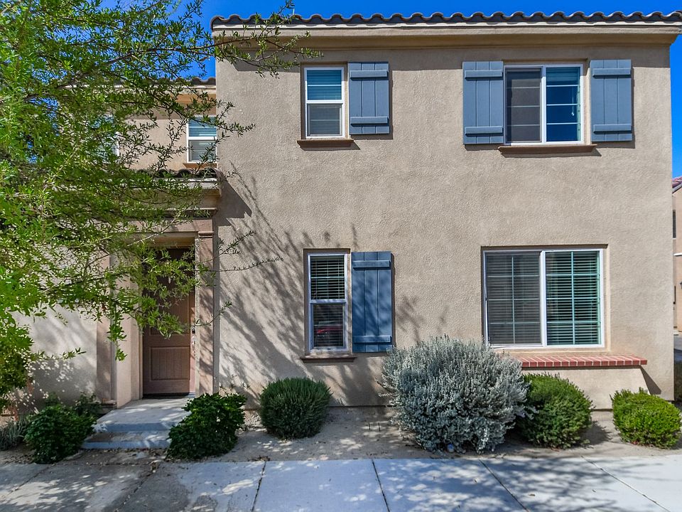 Beautiful 3 bedroom, 2.5 bathroom, 2 story home in the gated community of Spanish Walk in Palm Desert! Enjoy high ceilings, an open floor plan, elegant laminate wood flooring, and ceiling fans. The kitchen offers stylish white cabinetry, black stone countertops, and stainless steel appliances. The primary bedroom features a walk-in closet, dual sinks in the primary bathroom, a soaking tub, and shower. Additional property highlights include sliding doors to the private courtyard, 2 car garage, and laundry room. Community amenities include 3 pools, spa, gym, billiard room, parks, playground, and walking paths. Convenient to area schools, shopping plazas, restaurants, and hiking trails!