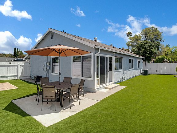 Outdoor patio with seating area and umbrella, ideal for enjoying the California sun