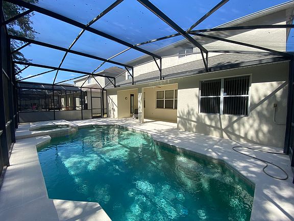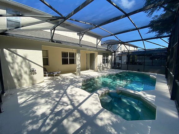 Come view this large, 2-story home, in the Retreat at Legacy Park. Centrally located to 27, 192 and Highway 27. "Four Corner's" area. This home has 5 bedrooms, 4-1/2 bathrooms. The master bedroom is located upstairs with a very large walk-in closet. Master bath has double sink, shower and separate tub. There is an additional ensuite bedroom downstairs with a full bathroom that leads out to the pool area. Lots of living space available. Eat-in space in galley kitchen, connected to a family room. Formal living/dining room combo at the front of the home. Fully equipped kitchen with a refrigerator, dishwasher, microwave and stove. Lovely private screened in pool/spa combo. Lawn and pool care included. Don't miss this great opportunity! (Pool heater is not operational) (washer and dryer, if provided, are convenience items to the tenant and not guaranteed.) Renter responsible for utilities, cable and internet. No smoking in premises. Lawn and pool care included n rent.